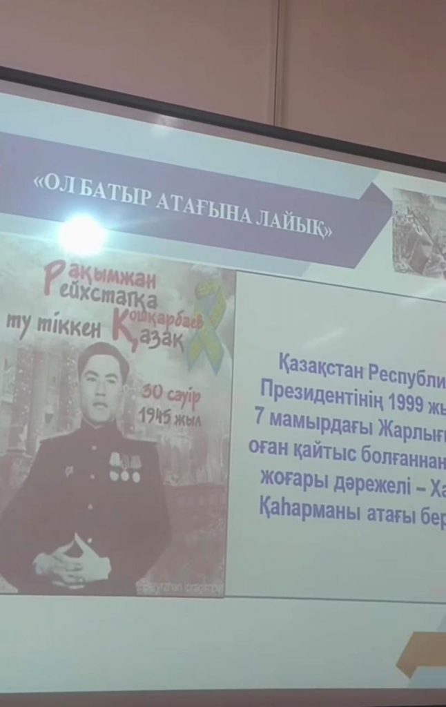 Р. Қ. Қошқарбаевтың туғанына 100 жыл толуына орай, “Рахымжан Қошқарбаев. Рейхстагқа тігілген ту” тақырыбында сынып сағаты өткізілді.