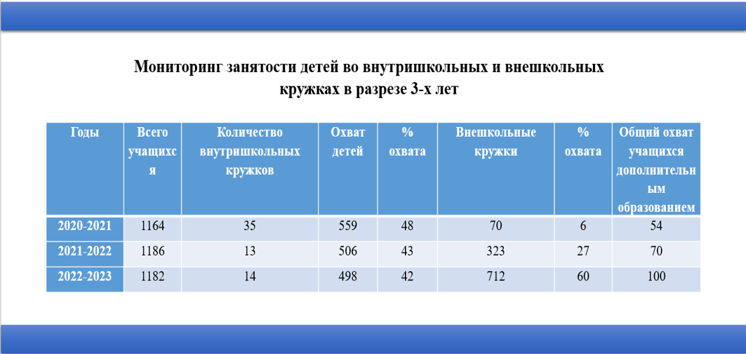 Общее количество охваченных дополнительным образованием составляет в стенах школы 498 человек, 42 %.